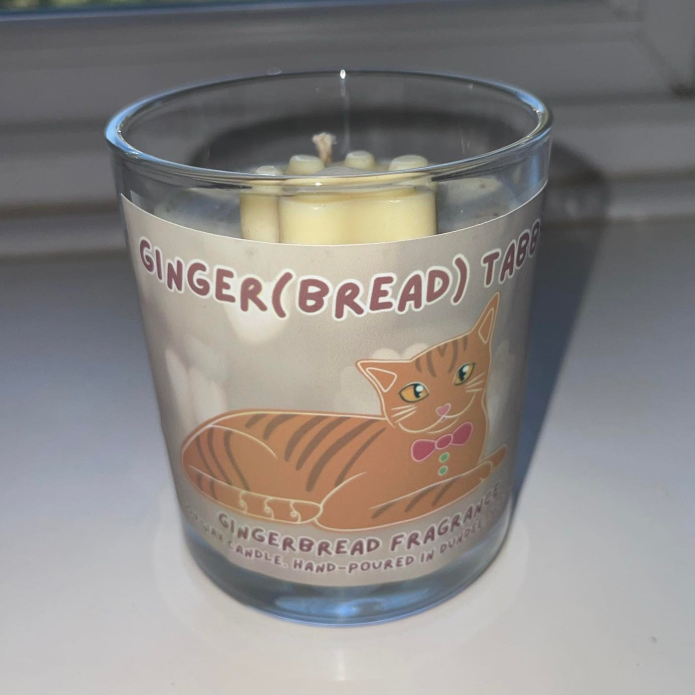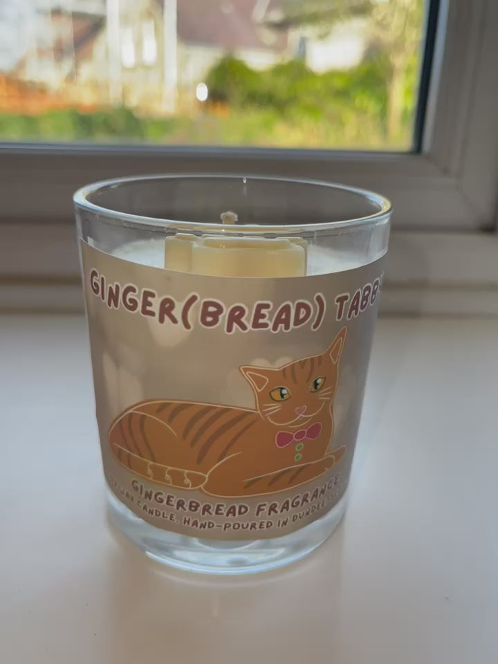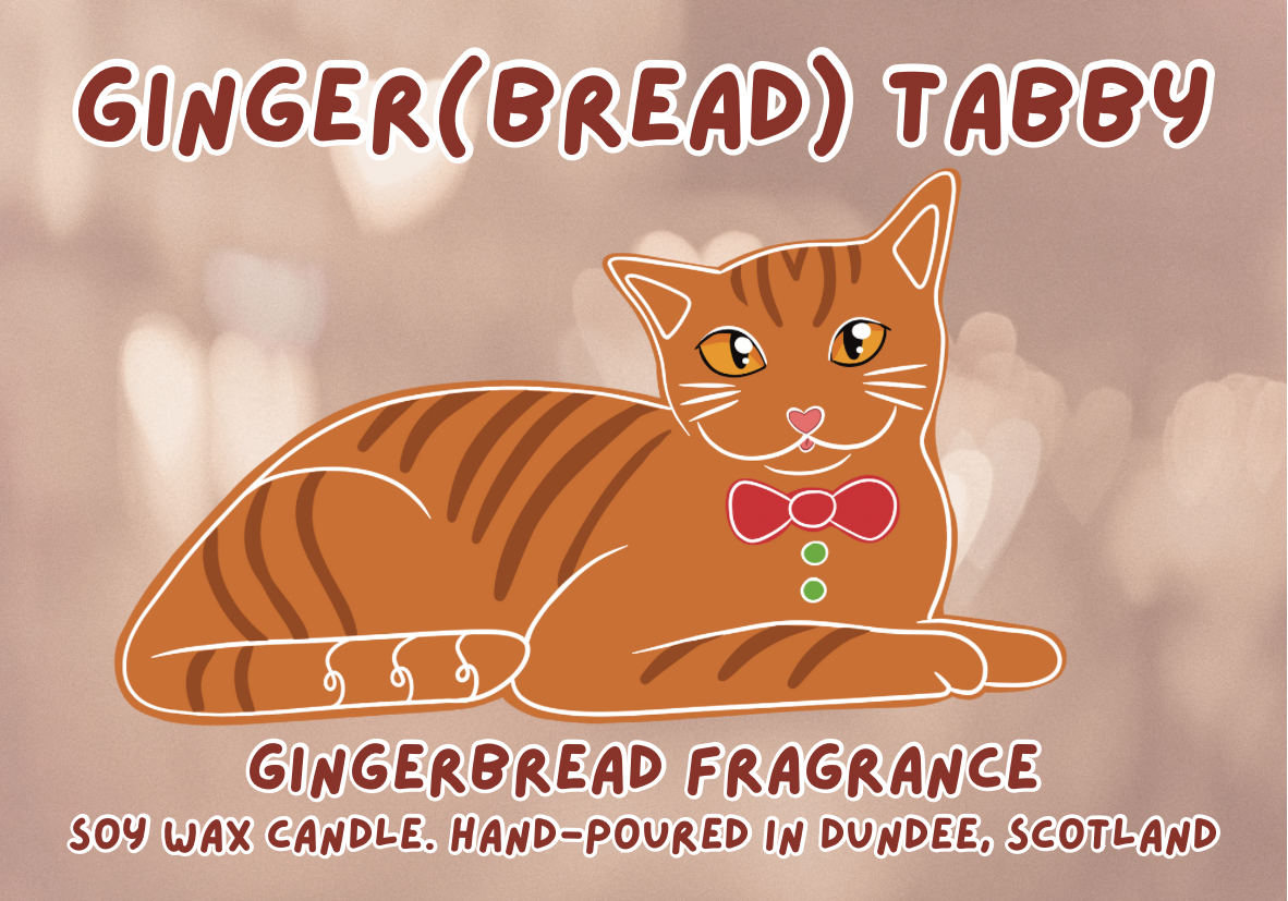 Bring the cozy warmth of a gingerbread scent into your home with our Gingerbread Tabby candle!