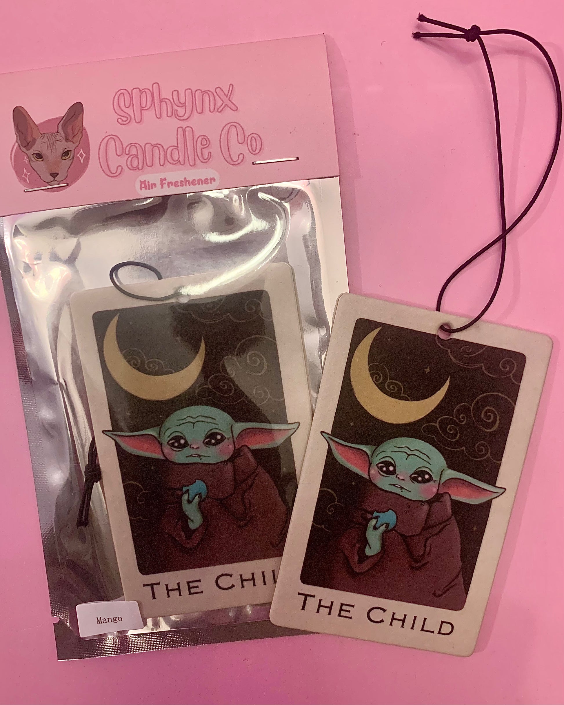 Baby Yoda for your car! This custom car air freshener features the adorable design of Grogu inspired by tarot cards.