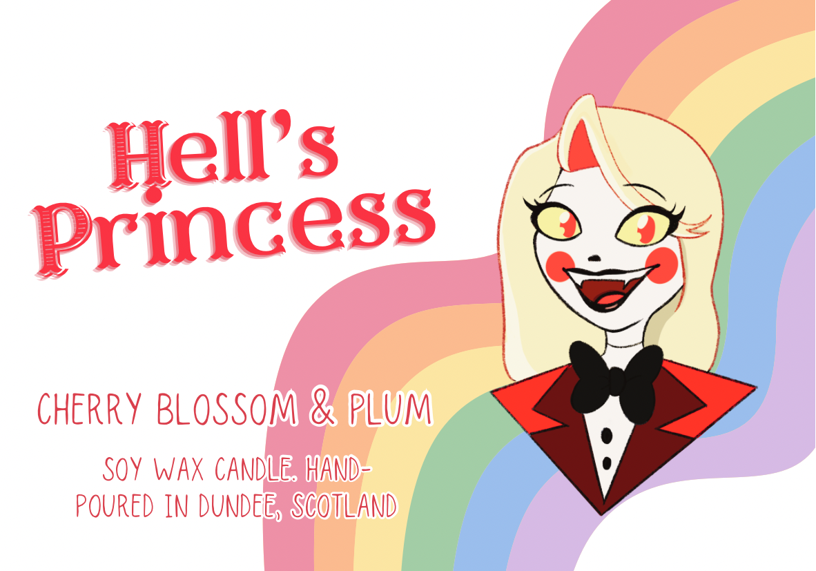 Inspired by Charlie from Hazbin Hotel, this soy wax candle has a sophisticated floral and delicately fruity fragrance that captures the unwavering spirit of the princess of hell herself!